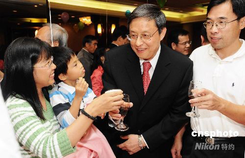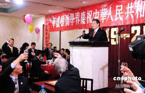 當(dāng)?shù)貢r間9月21日晚,中國駐美大使周文重(講臺上)、公使劉光源(左一)夫婦、公使謝鋒夫人、總領(lǐng)事吳冬梅等參加當(dāng)?shù)貎S學(xué)界慶祝中華人民共和國成立五十九周年晚會。周文重在晚會上致詞說,建國以來尤其是改革開放30年來,中國建設(shè)成就輝煌,2008年的中國經(jīng)受了各種嚴(yán)峻的考驗,兩岸關(guān)系出現(xiàn)了新的轉(zhuǎn)機,中華民族復(fù)興正面臨難得的歷史機遇。中新社發(fā) 邱江波 攝