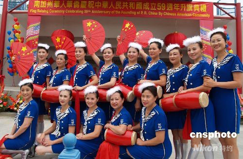當(dāng)?shù)貢r(shí)間9月21日上午,美國(guó)南加州華人華僑慶祝中華人民共和國(guó)成立59周年“十一”國(guó)慶升旗典禮儀式在洛杉磯巴恩斯公園隆重舉行,活躍在美國(guó)主流社區(qū)的“洛杉磯第一腰鼓隊(duì)”在中國(guó)國(guó)慶升旗典禮上亮相。 中新社發(fā) 盧威 攝