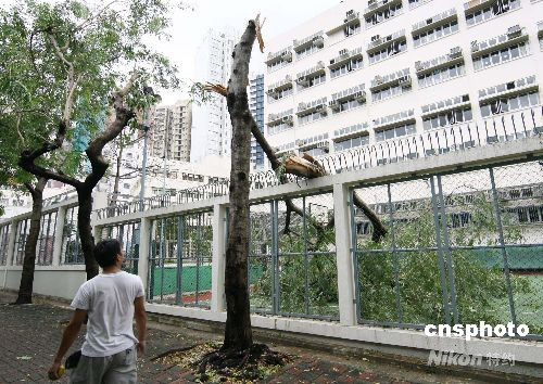 臺(tái)風(fēng)“黑格比”襲過(guò)香港后,九月二十四日早減弱為三號(hào)強(qiáng)風(fēng),香港所有上午校及全日制學(xué)校繼續(xù)停課。圖為灣仔區(qū)一棵大樹被吹折,倒落于一中學(xué)的操場(chǎng)內(nèi)。中新社發(fā) 武仲林 攝