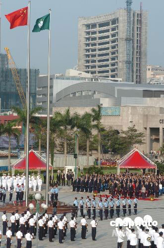 十月一日上午八時(shí),澳門各界在金蓮花廣場(chǎng)舉行隆重升國旗、區(qū)旗儀式,慶祝中華人民共和國成立五十九周年。中新社發(fā) 畢永光 攝