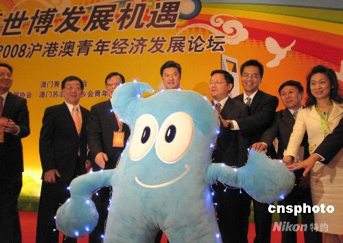 10月7日,“2008滬港澳青年經(jīng)濟發(fā)展論壇”在上海舉行。來自滬港澳三地的青年企業(yè)家、專家學者、學生領袖等400余人參加論壇,探討上海世博會的發(fā)展機遇與青年責任等話題。論壇由上海市青年聯(lián)合會、香港青年聯(lián)會、澳門青年聯(lián)合會等共同主辦,在上海、香港、澳門三地每年一屆、輪替舉行,今年為第十年。圖為滬港澳三地青年代表與上海世博會吉祥物“海寶”牽手,啟動論壇。中新社發(fā) 許曉青 攝