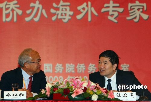 10月27日,第二屆國(guó)務(wù)院僑辦海外專(zhuān)家咨詢(xún)委員會(huì)會(huì)議在北京舉行。圖為國(guó)務(wù)院僑務(wù)辦公室副主任任啟亮(右)與華裔美籍電機(jī)工程學(xué)家卓以和(左)在會(huì)上交流。中新社發(fā) 廖文靜 攝