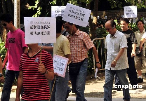 十月二十八日,香港逾百名的士司機(jī)到立法會(huì)外請(qǐng)?jiān),要求撤銷“短加長減”方案。方案將市區(qū)的士起價(jià)由十六元加至十八元,而乘搭的士長途車,則只需支付現(xiàn)時(shí)約八折的車資。中新社發(fā) 譚達(dá)明 攝