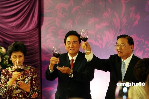 十月一月三日晚,臺(tái)灣;鶗(huì)董事長(zhǎng)江丙坤在101大樓設(shè)宴,為中午抵臺(tái)的海協(xié)會(huì)會(huì)長(zhǎng)陳云林洗塵。中新社發(fā) 洪少葵 攝