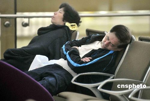 圖為兩名女士在香港國(guó)際機(jī)場(chǎng)等候消息。
