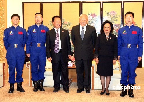 十二月六日,全國政協(xié)副主席董建華在中央人民政府駐香港聯(lián)絡(luò)辦公室會(huì)見“神舟七號(hào)”載人航天飛行代表團(tuán)一行,并與代表團(tuán)團(tuán)長及三名航天員合影留念。中新社發(fā) 張勤 攝