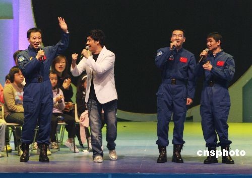 十二月九日晚,澳門舉行“航天英雄·情系濠江”晚會(huì),歡迎“神舟七號(hào)”載人航天飛行代表團(tuán)一行。圖為翟志剛、劉伯明、景海鵬三位航天員與澳門歌手合唱《龍的傳人》。中新社發(fā) 武仲林 攝