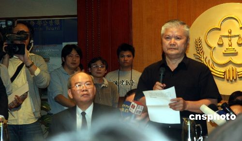 臺(tái)灣“檢察總長”陳聰明(左一)主持下午的新聞發(fā)布會(huì),特別偵查組發(fā)言人陳云南(右一)向媒體介紹了偵查結(jié)果及長達(dá)二百零九頁的起訴書基本內(nèi)容,臺(tái)灣檢方依“貪污治罪條例”等罪將陳水扁等十四人提起公訴。