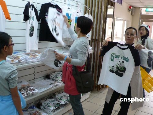 大陸贈臺大熊貓“團(tuán)團(tuán)”“圓圓”十二月二十三日晚間抵達(dá)臺北市立動物園。動物園內(nèi)紀(jì)念品商店里的大熊貓相關(guān)商品進(jìn)貨數(shù)量激增,民眾購買熱情高漲。圖為臺灣民眾在選購印有大熊貓圖案的T恤衫。中新社發(fā) 路梅 攝