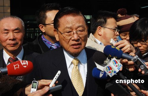 一月九日上午,海協(xié)會與海基會聯(lián)合參訪團在廣州考察一家臺資企業(yè)?疾旖Y(jié)束后,臺灣;鶗麻L江丙坤接受兩岸記者聯(lián)合采訪。中新社發(fā) 柯小軍 攝