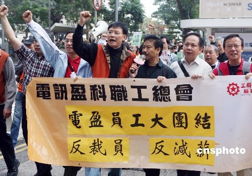 二月二十二日,約三百名電訊盈科員工在香港游行,抗議電盈在有盈利的情況下裁員,沒有盡社會責(zé)任。中新社發(fā) 武仲林 攝