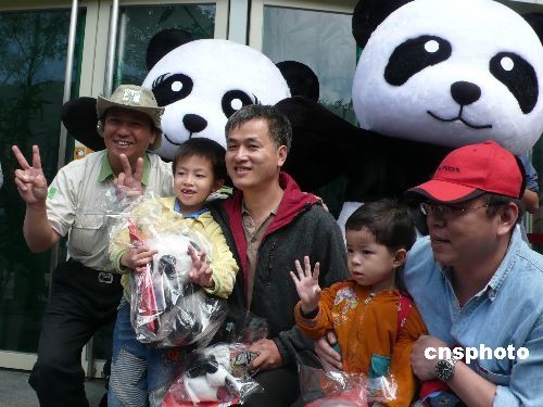 從1月26日農(nóng)歷春節(jié)大年初一正式與臺灣民眾見面到二月二十八日,大陸贈臺大熊貓“團團”和“圓圓”吸引臺灣民眾參觀人數(shù)已突破五十萬人。二十八日,第五十萬名幸運觀眾是來自臺灣彰化縣的八歲男童魏奕凱(左二),他的父親魏豐評(左三)以及另一名來自苗栗縣的五歲男童邱冠綸(右二),分別為第五十萬零一和第四十九萬九千九百九十九名觀眾。臺北市立動物園園長葉杰生(左一)向這三名幸運觀眾贈送裝滿大熊貓禮品的福袋和大熊貓玩偶作為紀念。中新社發(fā) 路梅 攝