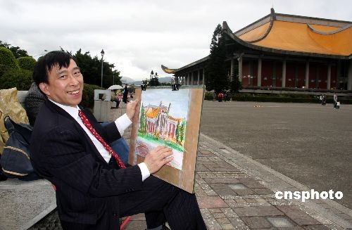 2月28日,應(yīng)臺(tái)北故宮博物院邀請(qǐng)前來(lái)臺(tái)灣參訪的上海博物館館長(zhǎng)陳?ài)凭,在參觀臺(tái)北“國(guó)父紀(jì)念館”畫展后,忙里偷閑用隨身攜帶的畫具在紀(jì)念館前寫生。中新社發(fā) 陳立宇 攝