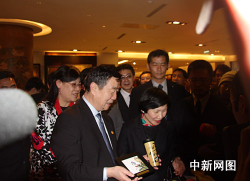 3月1日中午,回訪臺北故宮博物院的北京故宮博物院院長鄭欣淼一行抵達臺北,下午即到臺北故宮博物院參訪。圖為參觀禮品部時,臺北故宮博物院院長周功鑫向鄭欣淼(左二)一行致贈禮品。陳立宇 攝