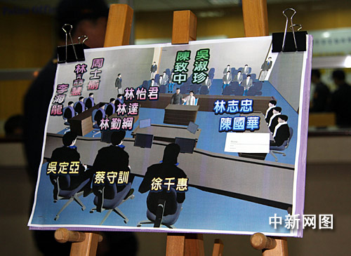 3月3日,陳水扁妻子吳淑珍第二次出庭。圖為今天下午,臺灣媒體在臺北地方法院圖解吳淑珍出庭時法官、檢察官、律師陣容。中新社記者 陳立宇 攝