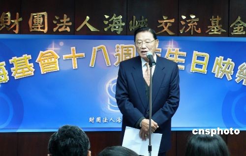 三月九日,臺(tái)灣海峽交流基金會(huì)在臺(tái)北舉辦成立十八周年慶;顒(dòng)。該會(huì)董事長(zhǎng)江丙坤表示,兩岸“大三通”基本實(shí)現(xiàn)后,其效果逐漸顯現(xiàn),海基會(huì)未來(lái)將會(huì)繼續(xù)推動(dòng)兩岸制度性協(xié)商,共期兩岸和平,經(jīng)濟(jì)繁榮。中新社發(fā) 路梅 攝