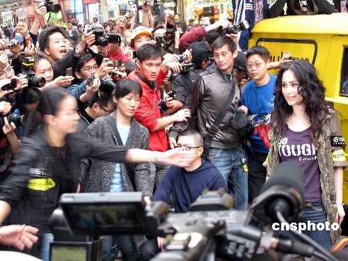 三月十一日,藝人不雅照女主角之一的鐘欣桐(阿嬌)復(fù)出后首次現(xiàn)身香港鬧市街頭,引來數(shù)百人圍觀,爭相拍攝。阿嬌復(fù)出后首份工作是擔任一個牛仔褲品牌的代言人,當日出席該品牌一分店的宣傳活動。中新社發(fā) 黎金良 攝
