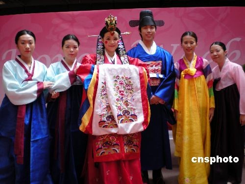 為促進(jìn)中韓文化交流,一場(chǎng)別開生面的傳統(tǒng)韓國(guó)婚禮示范二十日在香港城市大學(xué)舉行。演示婚禮的城大師生及旅港韓國(guó)僑民,身穿傳統(tǒng)的韓國(guó)婚禮服飾,在傳統(tǒng)韓國(guó)音樂中,重現(xiàn)傳統(tǒng)韓國(guó)婚禮的各項(xiàng)細(xì)節(jié),包括奠雁禮、交拜禮、合巹禮等。中新社發(fā) 陳伊敏 攝