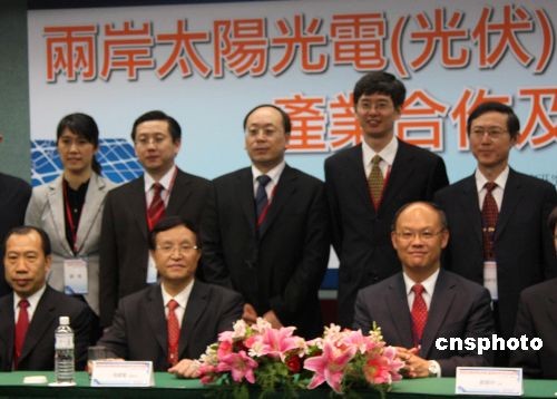 三月二十四日,發(fā)改委副主任張國寶以國家發(fā)改委能源所名譽(yù)所長的名義,率六十余人的代表團(tuán)抵達(dá)臺灣出席“兩岸太陽光電產(chǎn)業(yè)合作及交流會議”。會議開幕前,張國寶率代表團(tuán)主要成員與臺灣“經(jīng)濟(jì)部”次長鄧振中在臺北合影。中新社發(fā) 耿軍 攝