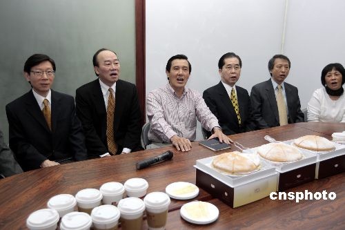3月30日,臺(tái)灣地區(qū)領(lǐng)導(dǎo)人選舉當(dāng)選人馬英九(左二)在國(guó)民黨中央黨部大樓接見女師附小小學(xué)同學(xué),在會(huì)見室里一起唱起校歌并切蛋糕表示慶祝。中新社發(fā) 杜洋 攝