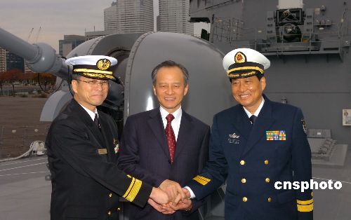 圖為中國海軍艦艇訪日團(tuán)指揮員肖新年少將(右)、中國駐日使館崔天凱大使(中)與日本海上自衛(wèi)隊(duì)第一護(hù)衛(wèi)隊(duì)群河村司令(左)在日方107號護(hù)衛(wèi)艦面對記者,共同握手。
