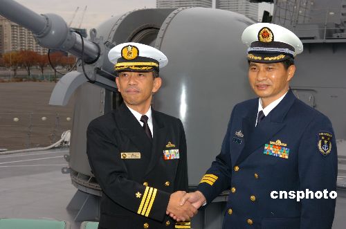 圖為中國海軍“深圳號”艦長朱建達(dá)上校在參觀日方107號護(hù)衛(wèi)艦后,與護(hù)衛(wèi)艦宮崎艦長握手。