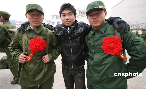 12月11日下午,家住安徽蒙城縣漆園辦事處城北村的雙胞胎兄弟鄭根林、鄭隨林同時(shí)參軍,起程開(kāi)赴各自部隊(duì)開(kāi)始多彩的軍營(yíng)生活。鄭家兄弟自幼羨慕軍營(yíng)生活,今年冬季征兵開(kāi)始后,兄弟倆一起報(bào)名參加體檢和政審,并雙雙通過(guò),被解放軍某部和武警某部批準(zhǔn)入伍,雙胞胎兄弟同時(shí)參軍入伍在當(dāng)?shù)貍鳛榧言?huà)。中新社發(fā) 胡衛(wèi)國(guó) 攝