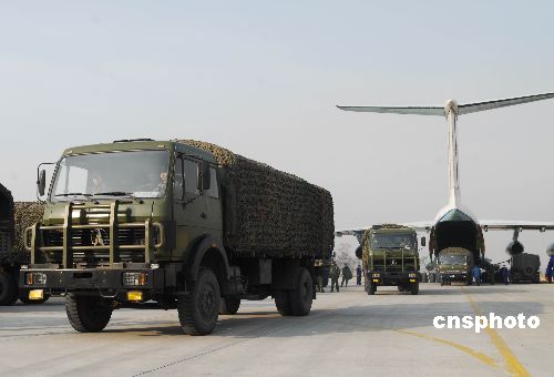 2月1日下午,中國空軍運輸機再次抵達山西長治某軍用機場,緊急空運救災(zāi)物資到南方冰雪災(zāi)區(qū)。從1月31日起,中國空軍運輸機多次飛抵該機場,駐當(dāng)?shù)啬巢肯群蟪鰟庸俦?00多人次,動用車輛裝備130多臺次,日夜奮戰(zhàn),已經(jīng)將100多噸棉被棉衣等救援物資分6個架次空運南方,以解南方災(zāi)區(qū)人民御寒之急。中新社發(fā) 姚林 攝
