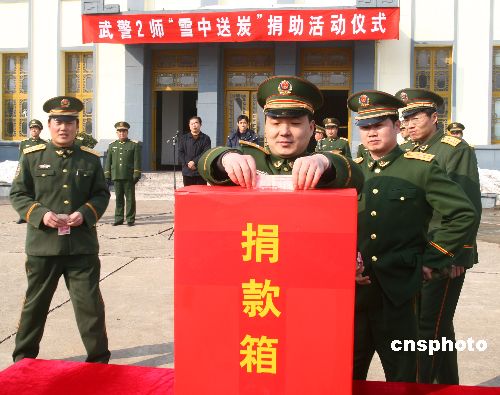 2月3日,駐江蘇宜興武警部隊舉行“雪中送炭”捐款活動,官兵們向宜興慈善會捐款73540.5元,這些善款不久將轉送到災民手中。中新社發(fā) 丁煥新 攝