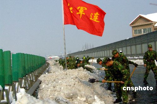 2月3日,南京軍區(qū)“硬骨頭六連”所在師5000余名官兵,在杭州繞城高速公路上破冰鏟雪。獲榮譽稱號的“紅軍團”、“百將團”、“抗洪模范團”官兵急速救援。破冰中,20臺重型工程車發(fā)揮了重要作用,已清理和打通高速公路123公里,初步打通了天堂杭州的“生命線”。 中新社發(fā) 邱柏星 攝