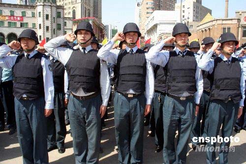 5月8日,遼寧省暨沈陽市保安系統(tǒng)奧運(yùn)安保誓師大會在中山廣場舉行。會上公安部門領(lǐng)導(dǎo)對保安提出要求,保安代表表決心,與會保安人員面對國旗和奧運(yùn)會會旗莊嚴(yán)宣誓:一切服從奧運(yùn)會,誓保奧運(yùn)會的絕對安全。參加大會的有各級領(lǐng)導(dǎo)、各方面安保代表600多人。中新社發(fā) 劉寶成 攝