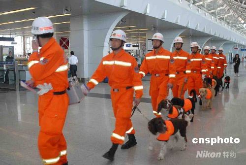 5月13日,沈陽(yáng)市消防支隊(duì)30名特勤官兵帶著10條消防搜救犬,乘專(zhuān)機(jī)火速奔赴四川地震災(zāi)區(qū),全力參加抗震救災(zāi)。 圖為出發(fā)前的特勤官兵和搜救犬。中新社發(fā) 王忠喜 攝