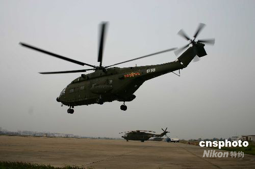 5月14日8時(shí)30分,空降兵某部直升機(jī)大隊(duì)奉命緊急出動(dòng)兩架直升機(jī)趕赴四川汶川地區(qū),支援先頭部隊(duì)參與搶險(xiǎn)救災(zāi)任務(wù)。中新社發(fā) 陳翊 攝