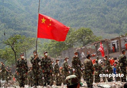 五月十九日下午兩點(diǎn)二十八分,在重災(zāi)區(qū)北川參與救援的武警四川總隊(duì)內(nèi)江市支隊(duì)一百余名官兵舉行降半旗儀式,為地震遇難者默哀。中新社發(fā) 陽(yáng)年剛 攝