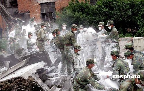 5月20日,濟(jì)南軍區(qū)某機(jī)步旅十二連官兵冒著中毒的危險(xiǎn),幫助四川省彭州市新科油化助劑有限公司緊急轉(zhuǎn)移增粘劑、阻燃劑等55噸有微毒的化學(xué)原料。官兵們?cè)谡鹚膹U墟中仔細(xì)尋找、快速搶運(yùn),把散落的化工原料用袋子裝起來(lái),為災(zāi)區(qū)挽回了300多萬(wàn)元的損失。圖為官兵們搶運(yùn)時(shí)的情景。中新社發(fā) 施文標(biāo) 攝