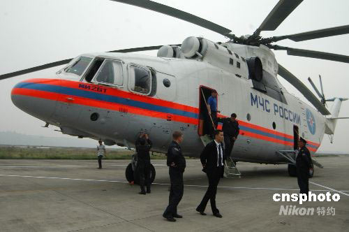 5月25日下午17時(shí)45分,一架俄羅斯米-26重型運(yùn)輸直升機(jī)降落四川綿陽(yáng)南郊機(jī)場(chǎng)。據(jù)俄羅斯機(jī)長(zhǎng)安東介紹,米-26重型運(yùn)輸直升機(jī)可24小時(shí)晝夜飛行,可在能見(jiàn)度600米、高度60米的空域執(zhí)行任務(wù)。10名機(jī)組人員經(jīng)常參與國(guó)際救援任務(wù),對(duì)山區(qū)復(fù)雜地形執(zhí)行救援任務(wù)有著豐富經(jīng)驗(yàn)。米-26是目前世界上最大的直升機(jī),被稱為“空中巨無(wú)霸”,一次運(yùn)載能力達(dá)20噸。中新社發(fā) 成和平 攝