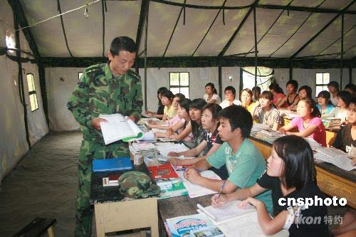 5月25日,蘭州軍區(qū)部隊官兵為文縣中廟鄉(xiāng)災區(qū)學生上課。地震使該鄉(xiāng)多所學校倒塌,學生無法正常上課。部隊從官兵中抽調(diào)大學生,在部隊駐地搭建帳篷,為100多名中小學生上課。中新社發(fā) 劉二銀 攝