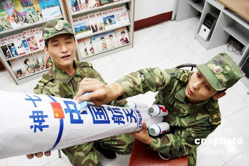 9月23日,濟(jì)南軍區(qū)某部,一級士官馬迪正在展示自己制作的“神七”載人飛船模型。得知“神七”載人飛船即將發(fā)射的消息后,他利用收集的廢棄易拉罐、可樂瓶,動手創(chuàng)作了“神七”載人飛船模型,表達(dá)對我國航天事業(yè)成果的祝福。中新社發(fā) 梁志杰 攝