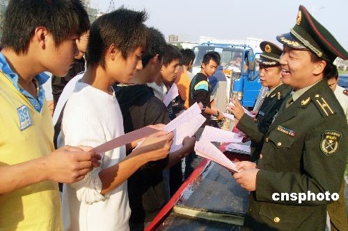 10月15日,江蘇省鎮(zhèn)江市潤州區(qū)人武部干部在向第三職教中心的學(xué)生宣傳征兵新政策。當(dāng)日,江蘇省鎮(zhèn)江市潤州區(qū)人武部干部分別走進(jìn)轄區(qū)內(nèi)的鎮(zhèn)江市第三職教中心和江蘇科技大學(xué),結(jié)合今年冬季征兵新政策,重點(diǎn)面向大學(xué)和高中的應(yīng)屆畢業(yè)生開展征兵宣傳,鼓勵(lì)廣大學(xué)子積極應(yīng)征入伍,為祖國的國防建設(shè)出力。中新社發(fā) 石玉成 攝
