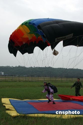 11月初,第七屆中國國際航空航天博覽會上,中國空軍跳傘運動大隊的27名隊員先后進(jìn)行了跳傘表演,其中的喜從天降、航空盛典、東方之珠、金龍飛舞、空中彩虹等精彩課目。圖為空軍跳傘運動大隊隊員肖茜蓉帶著鮮艷的五星紅旗第一個從天而降。中新社發(fā) 譚超 攝