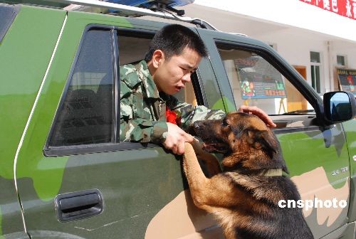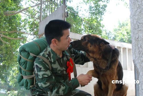 十一月二十四日,武警福建總隊直屬支隊的訓犬員張世均與息息相處五年的無言戰(zhàn)友“飛虎”依依惜別。又到老兵退伍的日子,在武警福建總隊服役期滿的三千多名老兵,開始踏上返鄉(xiāng)的路程。中新社發(fā) 曾朝群 攝