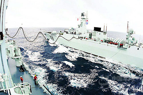 海軍赴索馬里海域護(hù)航編隊進(jìn)行海上補(bǔ)給演練