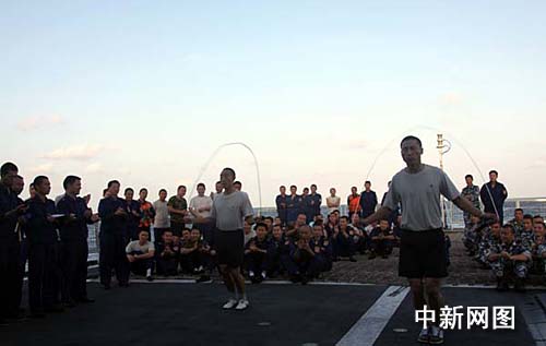 中新網(wǎng)“海口”艦1月10日電 當(dāng)?shù)貢r間1月10日下午,正在亞丁灣海域執(zhí)行護航任務(wù)的“?凇碧枌(dǎo)彈驅(qū)逐艦繼續(xù)舉行甲板運動會,參賽官兵參加跳繩項目比賽。