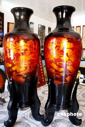 圖為10月23日拍攝到的江西鄱陽(yáng)一對(duì)高180厘米脫胎漆器金龍瓶。該瓶以生漆為原料,經(jīng)制模、裹布和脫胎、拋光等50多道純手工工序,由該縣一民營(yíng)企業(yè)歷經(jīng)2年半時(shí)間制作完成,是目前國(guó)內(nèi)最高的一對(duì)脫胎漆器金龍瓶。據(jù)悉,被譽(yù)為“中華三寶”之一的脫胎漆器,始于東漢。鄱陽(yáng)脫胎漆器歷史悠久,現(xiàn)已被列入江西省非物質(zhì)文化遺產(chǎn)名錄。中新社發(fā) 卓忠偉 攝