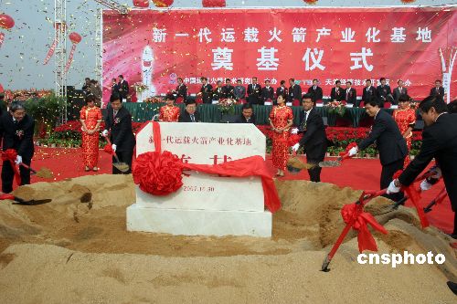 十月三十日,中國國防科學技術(shù)工業(yè)委員會、天津市政府官員同中國航天科技集團公司及該公司所屬中國運載火箭技術(shù)研究院負責人等,在天津濱海新區(qū)為中國新一代運載火箭產(chǎn)業(yè)化基地揮鍬奠基。中國新一代運載火箭產(chǎn)業(yè)化基地項目,是新一代運載火箭研制工程的基礎(chǔ)保證,也是后續(xù)批量生產(chǎn)和產(chǎn)業(yè)化、軍民結(jié)合的航天高科技重要基地。該項目總投資約數(shù)十億元人民幣,總占地面積約三千畝,分為一期工程和二期工程。建成后將滿足中國未來三十至五十年發(fā)展空間技術(shù)及和平利用空間的需要,實現(xiàn)運載技術(shù)跨越式發(fā)展和航天可持續(xù)發(fā)展,對引領(lǐng)中國高科技產(chǎn)業(yè)發(fā)展有著重大的輻射和推動作用。中新社發(fā) 孫自法 攝