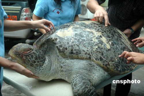 2007年11月1日,海南省小動(dòng)物保護(hù)協(xié)會(huì)在海口市東海岸海邊救助一只約1米多長(zhǎng)、重150公斤左右的國(guó)家二級(jí)野生保護(hù)動(dòng)物綠海龜,移交給海洋漁業(yè)部門處理。該只罕見(jiàn)的綠海龜由附近居民發(fā)現(xiàn)后并自發(fā)呵護(hù),但救助時(shí)已經(jīng)死亡。海南省漁業(yè)監(jiān)察總隊(duì)有關(guān)負(fù)責(zé)人稱,初步估計(jì)它至少有100歲以上,身上有多處傷痕,需要解剖才能查明真正死因,有關(guān)方面將把它制作成標(biāo)本展覽,以教育人們保護(hù)海龜。中新社發(fā) 善平 攝