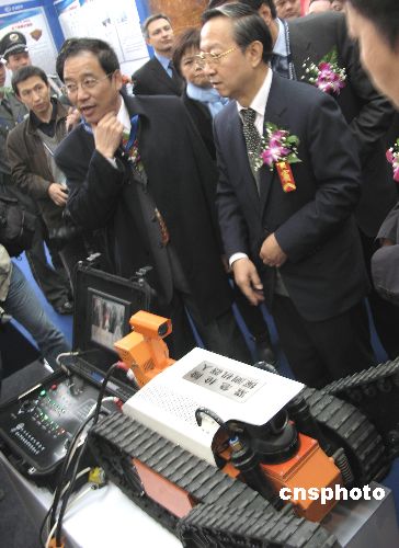 11月6日上午,“第十二屆中國(guó)國(guó)際煤炭采礦技術(shù)交流及設(shè)備展覽會(huì)”在北京全國(guó)農(nóng)業(yè)展覽館開幕。開幕式上,中國(guó)國(guó)家安全監(jiān)督管理總局局長(zhǎng)李毅中來到1號(hào)展廳,在中國(guó)研制的首臺(tái)“緊急搶險(xiǎn)探測(cè)機(jī)器人”前,詢問有關(guān)技術(shù)指標(biāo)。這臺(tái)由哈工大機(jī)器人研究所與唐山開誠(chéng)公司共同研制的有線遙控機(jī)器人,可以在遇難、遇險(xiǎn)礦井中行走500米距離,并可以爬坡、越障,到達(dá)指定地點(diǎn),并探測(cè)井下有毒氣體、溫度、風(fēng)速數(shù)據(jù),對(duì)遇險(xiǎn)礦工地段進(jìn)行探測(cè)救險(xiǎn)。中新社發(fā) 鄒憲 攝