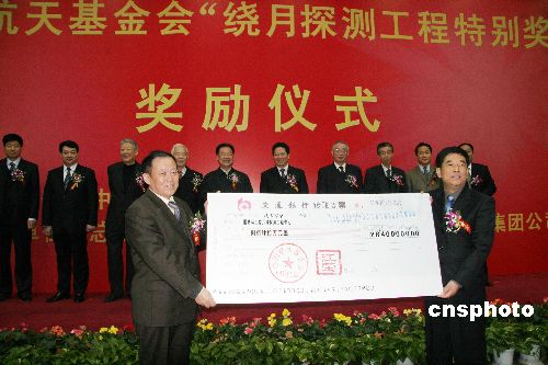 十二月三日,中國航天基金會秘書長霍廣耀(左)向國防科工委月球探測工程中心主任胡浩頒發(fā)“繞月探測工程特別獎”,獎金總額八百四十萬元人民幣,獎勵參加繞月探測工程研制、生產(chǎn)、發(fā)射、測控和應(yīng)用等任務(wù)中有突出貢獻(xiàn)的單位與個人。中新社發(fā) 孫自法 攝