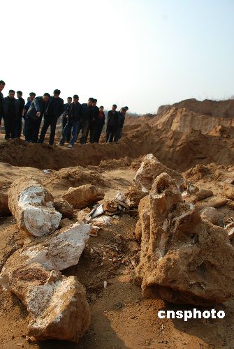 12月5日,山東淄博周村區(qū)王村鎮(zhèn)西道村磚廠挖掘出疑似“恐龍”的巨型動(dòng)物骨骼化石。當(dāng)日10點(diǎn)48分,正在淄博周村區(qū)王村鎮(zhèn)西道村磚廠施工的司機(jī)小郝,給村主任劉道新打電話說(shuō)“挖掘機(jī)在工作時(shí)挖到了大量的化石,很像是動(dòng)物的骨骼!痹诂F(xiàn)場(chǎng)進(jìn)行保護(hù)的彭陽(yáng)派出所的所長(zhǎng)于成杰介紹說(shuō),這次挖到的化石很大,露出來(lái)的化石有6米多長(zhǎng),呈圓柱狀細(xì)端的直徑有18-19厘米,粗端的直徑有30-40厘米。其動(dòng)物骨格的特征非常明顯,其體積顯然比大象要大的多,與史前動(dòng)物“恐龍”骨骼化石極其相似。中新社發(fā) 梁寶海 攝