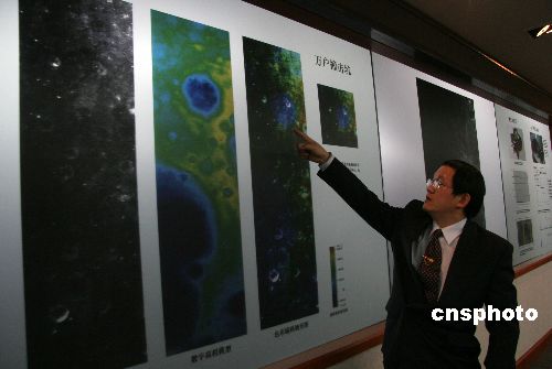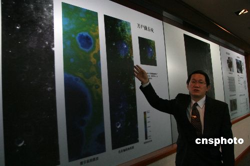 十二月十一日,中國繞月探測工程地面應用系統(tǒng)總設計師李春來,向媒體介紹“嫦娥一號”衛(wèi)星CCD相機對月球背面進行成像探測所獲取的“萬戶撞擊坑”。以中國明代人萬戶命名的“萬戶撞擊坑”直徑五十二公里,位于月球背面南緯九點八度、西經一百三十八點八度區(qū)域,地球上不能直接看到。中國國家航天局當天發(fā)布信息稱,目前,“嫦娥一號”衛(wèi)星的飛行、有效載荷的探測、地面的測控與通信、數(shù)據(jù)接收與處理均正常,衛(wèi)星CCD相機已對月球背面進行成像探測,并獲取月球背面部分區(qū)域的影像圖。中新社發(fā) 孫自法 攝